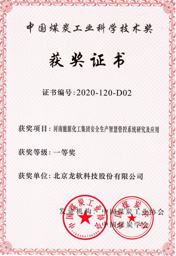 龍軟科技參與完成的科研成果“河南能源化工集團安全生產智慧管控系統研究及應用”榮獲中國煤炭工業協會2020年度科學技術獎一等獎