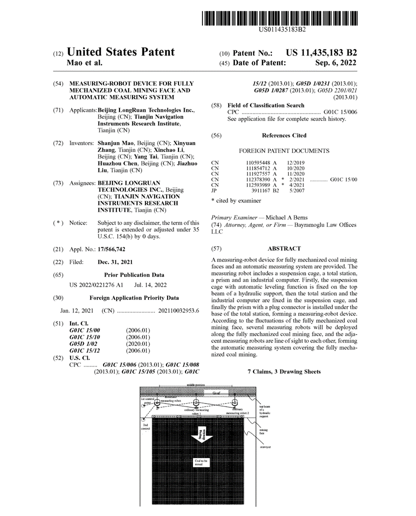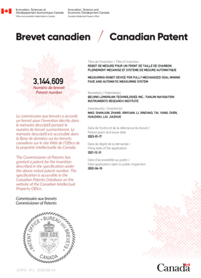 該發(fā)明于2021年5月獲國內(nèi)發(fā)明專利授權(quán),2022年9月陸續(xù)獲得國際授權(quán),提出了一種綜采工作面測量機器人裝置和自動測量系統(tǒng),測量機器人組成部分包括:吊籠、全站儀、棱鏡、工控機。將具備自動整平功能的吊籠固定吊裝在液壓支架頂梁上,然后將全站儀、工控機固定在吊籠中,最后將帶插接件的棱鏡和全站儀底座對接,形成一個測量機器人裝置。根據(jù)礦井綜采工作面起伏,沿綜采工作面依次布設(shè)多個測量機器人,且相鄰的測量機器人通視,構(gòu)成礦井覆蓋綜采工作面的自動測量系統(tǒng)。通過所述綜采工作面測量機器人裝置和自動測量系統(tǒng)實現(xiàn)了礦井綜采工作面固定和移動目標(biāo)的精確大地坐標(biāo)測量。