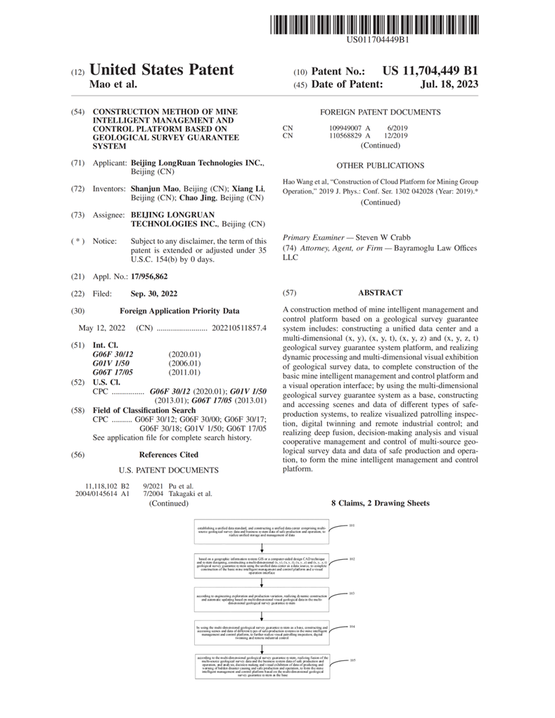 該發(fā)明于2022年8月獲得國內(nèi)發(fā)明專利授權(quán),2023年7月獲得國際授權(quán),提出了一種基于地質(zhì)測量保障系統(tǒng)的礦山智能化管控平臺建設(shè)方法:建立統(tǒng)一數(shù)據(jù)中心、多維(x,y)、(x,y,t)、(x,y,z)和(x,y,z,t)地質(zhì)測量保障系統(tǒng)平臺,實現(xiàn)地質(zhì)測量數(shù)據(jù)的動態(tài)處理和多維可視化展示,完成礦山智能化管控基礎(chǔ)平臺和可視化操作界面建設(shè);以多維地質(zhì)測量保障系統(tǒng)為基座,構(gòu)建并接入各類安全生產(chǎn)系統(tǒng)場景和數(shù)據(jù),實現(xiàn)可視化巡查、數(shù)字孿生和遠程工業(yè)控制;實現(xiàn)地測多源數(shù)據(jù)與安全生產(chǎn)經(jīng)營數(shù)據(jù)的深度融合、決策分析與可視化協(xié)同管控,形成智能化管控平臺。本發(fā)明提出了以地質(zhì)測量多維數(shù)據(jù)為基礎(chǔ)的智能化礦山管控新模式,實現(xiàn)了基于地質(zhì)測量保障系統(tǒng)的礦山智能化管控平臺建設(shè)。