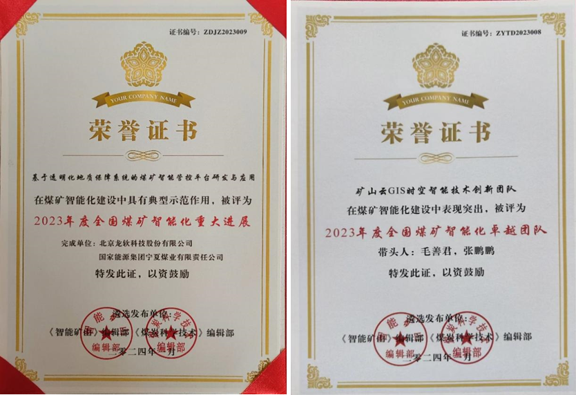 龍軟科技受邀參加會議并獲得兩項榮譽,其中“基于透明化地質(zhì)保障系統(tǒng)的煤礦智能管控平臺研發(fā)與應(yīng)用”被評為2023年度全國煤礦智能化重大進展,“礦山云GIS時空智能技術(shù)創(chuàng)新團隊”被評為2023年度全國煤礦智能化卓越團隊。