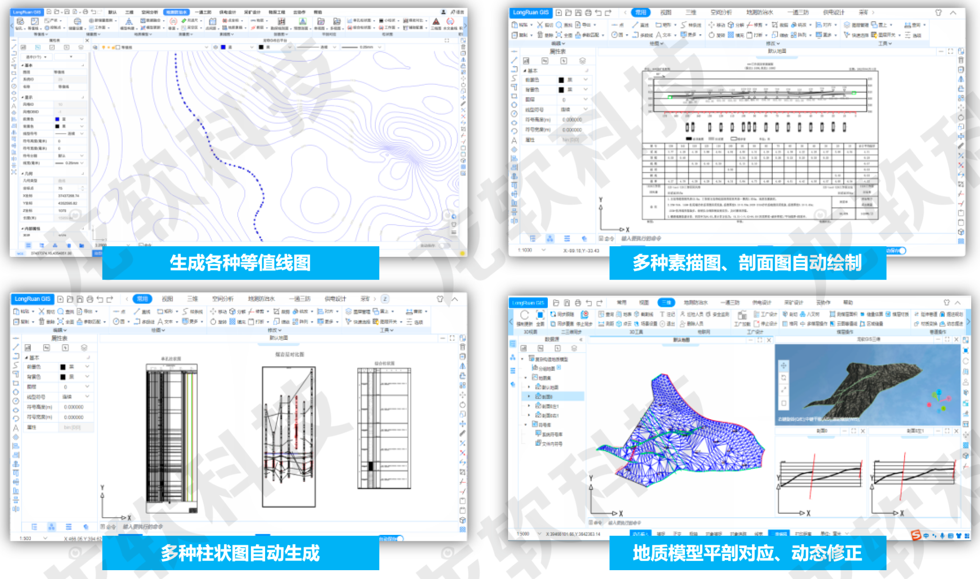 除了專業(yè)機(jī)電設(shè)備和環(huán)境監(jiān)測(cè)系統(tǒng)的生產(chǎn)外,龍軟科技-北大團(tuán)隊(duì)已經(jīng)成為國(guó)內(nèi)外煤礦智能化建設(shè)自主產(chǎn)業(yè)鏈較為完整的團(tuán)隊(duì)之一,從采掘透明化探測(cè)、礦山“采、掘、機(jī)、運(yùn)、通”和“水、火、瓦斯、頂板”多維專題圖形的處理、透明化地測(cè)保障系統(tǒng)、基于透明化地測(cè)的管控平臺(tái),到智能化綜掘、智能化綜采、智能化通風(fēng)、智能化洗選,都有專門的研發(fā)和實(shí)施團(tuán)隊(duì),而且成果眾多。智能化礦山建設(shè)產(chǎn)業(yè)鏈的重要基礎(chǔ)是透明化地測(cè)保障系統(tǒng),而透明化地測(cè)保障系統(tǒng)的基礎(chǔ)就是能夠處理各類專題圖形的GIS軟件系統(tǒng)。