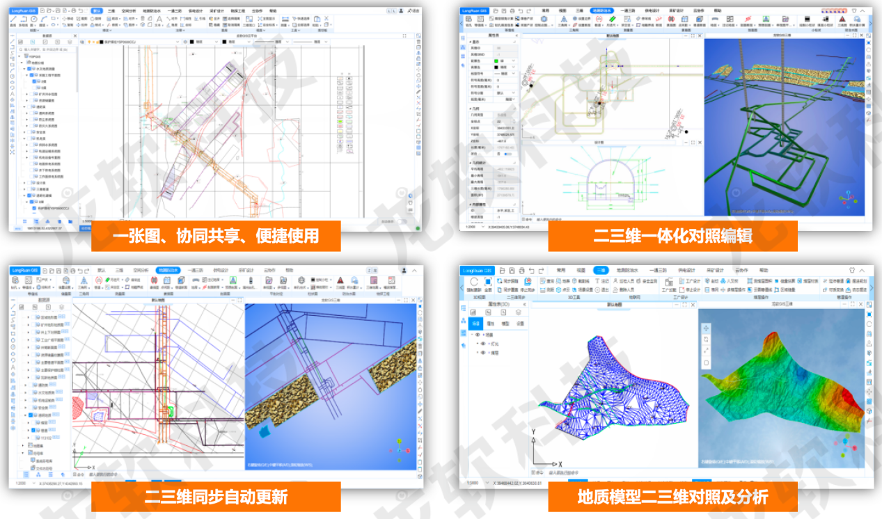 二三維一體化處理:基于云端同源數(shù)據(jù),提供同屏、雙向同步的二維、三維一體化應(yīng)用,自動(dòng)構(gòu)建礦山巷道、煤層、構(gòu)造、鉆孔等各類三維模型,提供二三維同步跟隨、對(duì)照編輯、自動(dòng)更新等便捷應(yīng)用。